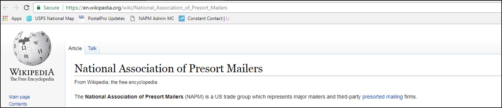 Established in June of 1984, the National Association of Presort Mailers (NAPM) is a nonprofit trade association whose company members include commingle/comail service providers, suppliers to the mailing industry and others who support the commingle/comail industry. Our members are early adopters and leading edge service providers of latest Postal Service products and innovations. Our member businesses are also industry adaptors -- as mailing customers' needs have changed, so too have our member companies so that today they also do marketing, data management, printing, list mailings, and combined/commingled mailings of all classes and categories (First Class Letters and Flats, Periodicals, Marketing Mail Letters and Flats, and Package or Priority Services). We also have vendor members that provide mailing technology and equipment solutions to mail users throughout the world.